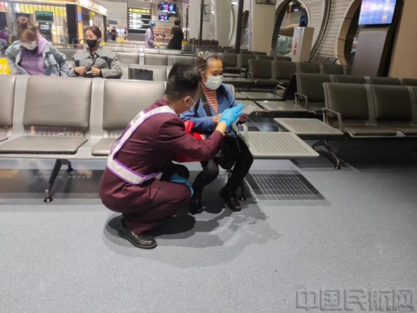周虹任俯下身子协助旅客填报信息