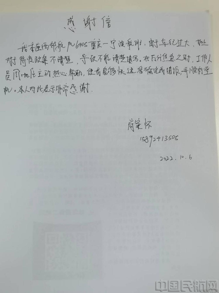 让周虹任印象比较深的,是今年10月一名年纪较大的旅客留下的手写感谢信。当天重庆飞往宁波航班临近截载时间,这位旅客焦急地找到周虹任寻求帮助,表示自己不清楚防疫政策细则,眼睛看手机也不清晰,一直没能填报上防疫信息,心里十分焦急。了解具体情况后,周虹任一边安抚旅客情绪让旅客不要着急,一边协助旅客完成了信息填报工作。“真的就是这么小的事儿,可是当收到其他工作人员转交给我的这封感谢信的时候,真的特别感动,一想到本来眼睛就不太好的老人,还特地手写感谢信,就觉得特别暖。”周虹任说到这里有些感动。