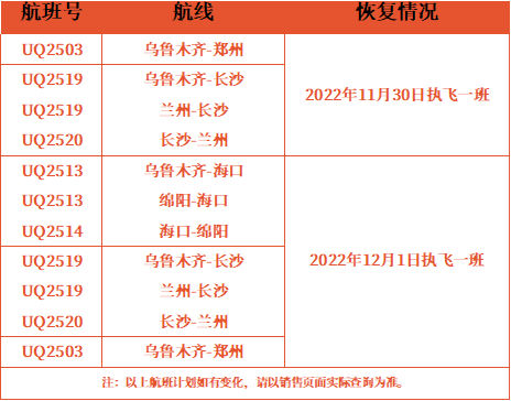 11月30日起,乌鲁木齐航空将恢复乌鲁木齐至郑州、乌鲁木齐至长沙、乌鲁木齐至海口等航线。其中,乌鲁木齐至郑州、乌鲁木齐至长沙航线于11月30日执飞。乌鲁木齐至海口、乌鲁木齐至长沙航线于12月1日执飞。后续,乌鲁木齐航空将积极协调,努力恢复乌鲁木齐至其他更多城市的航线航班。