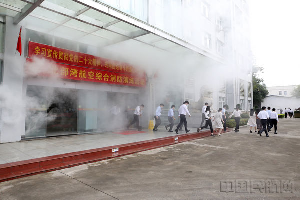 11月28日下午15时,演练组下达“点火”指令,演练保障人员将“烟饼”点燃。随着持续扩散的烟气,北部湾航空基地的消防警铃立即响起,消防逃生演练正式开始。各演练小组立即赶到“火灾”现场开展处置工作,安全组拉起禁戒线阻止无关人员进入,公司全体员工在疏散组的带领下迅速通过楼梯有序撤离至“北部湾航空应急撤离集结点”。在集结点清点人数的同时,疏散组在各楼层快速“扫楼”,确保没有遗留任何人员;灭火组在确保自身安全的前提下,使用灭火器灭火;救援组携带着应急救援物资,随时准备为受伤或窒息的人员急救。随后,“火险”被迅速控制,整个演练过程紧张有序。