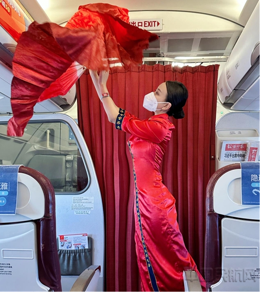 乘务员身着大红旗袍,伴随着优美的乐曲,舞动曼妙的身姿,手中的扇子伴随着音乐翩翩起舞。一段精彩绝伦的中国传统扇子舞呈现在旅客的眼前,客舱响起阵阵掌声。