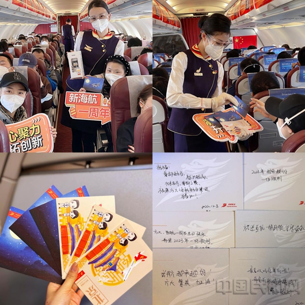 “旅客看首航”互动环节,乘务员为旅客分发首航独具特色的明信片,在万米高空诚挚邀请旅客在明信片留言,写下对首航的祝福。精美的图片设计吸引了旅客朋友们的注意力,这份云寄锦书的仪式受到了广大旅客的好评。