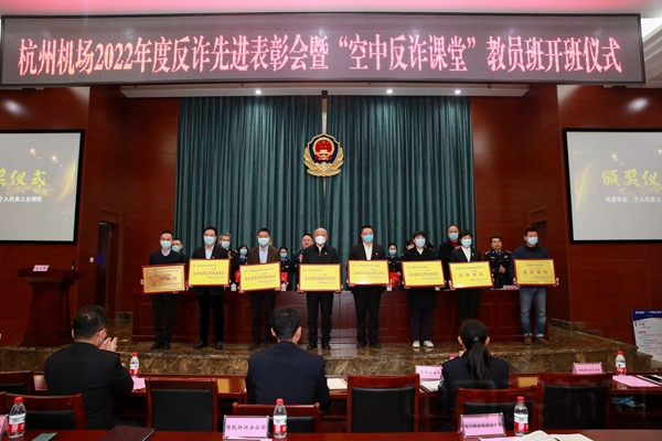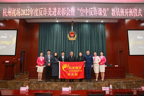 中国民航网讯:近日,长龙航空参加了浙江省公安厅机场公安局召开的杭州机场2022年度反诈先进表彰暨“空中反诈课堂”教员班开班仪式。长龙航空执行总裁张洪志、服务总监吴园、保卫部总经理陶黎荣、客舱部总经理余倩、保卫部副总经理许峰等领导以及反诈教员代表们参加了该仪式。仪式上长龙航空被授予2022年度“反诈宣传工作先进单位”“空中反诈课堂示范单位”称号。