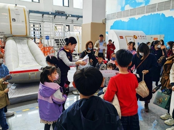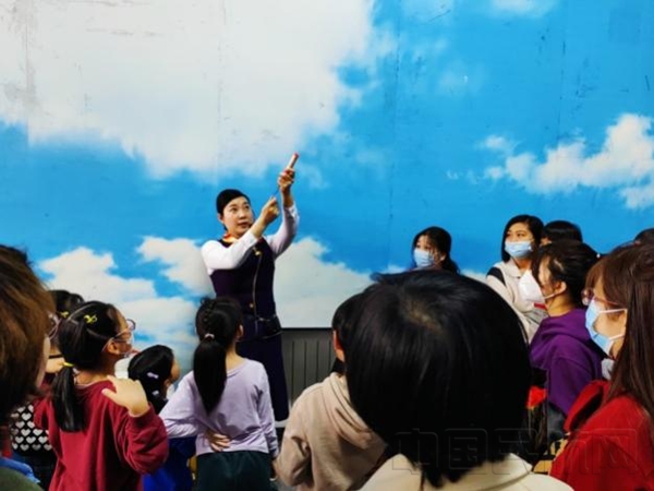 在天津航空乘务教员张丽热情的带领下,“航空探秘之旅”正式开始。A321翼上出口,E190动态舱,E190虚拟灭火舱,E190静态舱、A320静态舱,水上训练场……张丽教员逐一向大家介绍了“客舱训练模拟器家族成员”并讲解每台客舱训练模拟器的作用。“逃生”“跳滑”“迫降”“颠簸”“冲撞”“紧急情况开舱门”……这些看似专业又陌生的词汇,在张丽教员生动地讲解下变得通俗易懂,小朋友们竖着耳朵全神贯注地听,积极抢答张丽教员提出的问题,向父母炫耀着得到的奖品。在水上训练场中,张丽教员为小朋友和家长展示如何正确穿救生衣等,介绍基本的求生技能,得到了小朋友们的积极提问和互动。