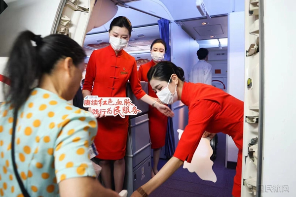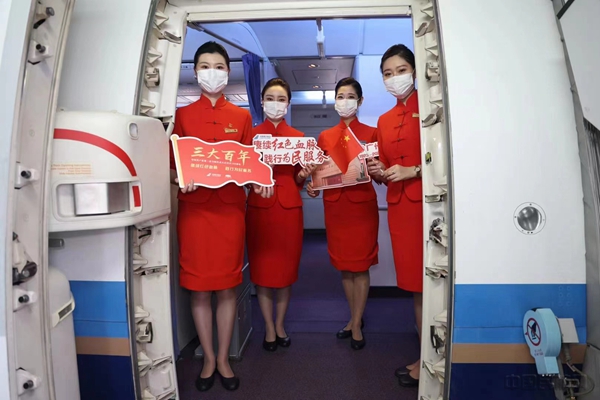 踏入机场,南航值机柜台摆放的中共三大百年纪念台卡,营造浓厚的党史学习氛围,明珠贵宾室内全天候播放的中共三大会址纪念馆宣传片,让旅客进一步感受百年党史伟力。登上航班,南航乘务组身着木棉红色旗袍,手持“赓续红色血脉 践行为民服务”手牌,党建新风扑面而来。“征程万里风正劲,重任千钧再奋蹄。南航将带您一起开启红色之旅,穿越百年风云,赓续红色血脉,汲取前行力量。”伴随着机长广播,红色之旅正式启航。乘务组通过定制广播、共话历史、知识问答等形式,与旅客重温峥嵘岁月,传承红色精神,使旅客在整个航行中“穿越时空”,沉浸式感受红色文化。
