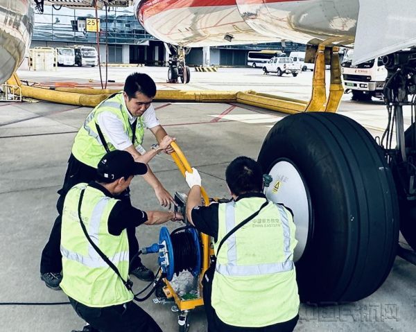 东航机务正在为一架刚落地的客机机轮通风散热(本文图片均由东航提供)