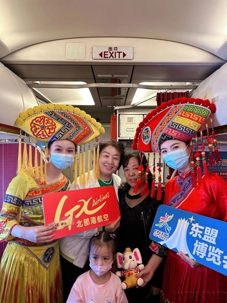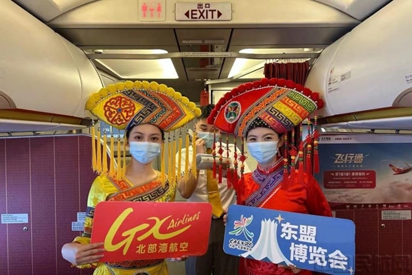 9月15日,北部湾航空GX8812西安飞往南宁的航班上,”青秀乘务组”精心策划迎接“中国—东盟博览会”主题客舱活动,利用空中展示平台,积极向旅客展示中国—东盟博览会盛况及东盟国家风土人情,营造东博会的浓厚氛围,展示广西本土航空企业的良好形象。