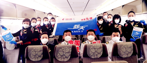 李文丽(前排左一)带领工作室劳模导师,集体执飞驰援武汉抗疫包机(东航客舱供图)