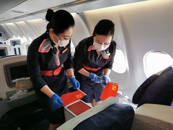 2020年7月1日,李文丽(右)带领工作室成员执飞“七一”主题航班(钱擘/摄)