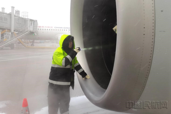 东航机务冒着大雪,在合肥机场检查飞机发动机(东航供图)