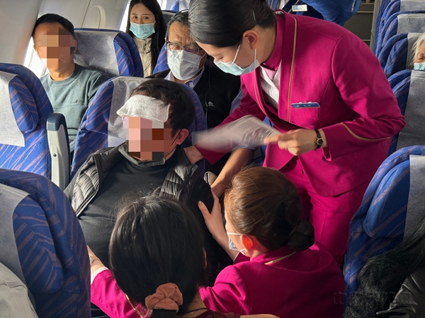 2月29日,在上海浦东至台北的CZ3095航班上,南航乘务员和医生正在为台胞旅客施救(梅芳/摄)