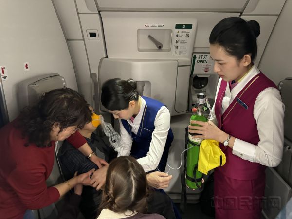 “乘务长,乘务长,有旅客晕倒了!”正在巡舱的乘务长张军,忽然听到中服务台乘务员向她求助,她立即前往查看。 当时航班正在巡航阶段,一位76岁的旅客在去洗手间时突发不适,眼疾手快的乘务员刘曼半蹲接住了即将晕倒的旅客。该旅客当时面色苍白,嘴唇没有血色,且无法自主沟通。见状乘务长张军立即将情况报告给主任乘务长范莹,同时广播寻找医生,并给旅客吸氧。在与旅客家人沟通后得知旅客有高血压病史且有自带药品,但此前从未出现过晕倒的情况。