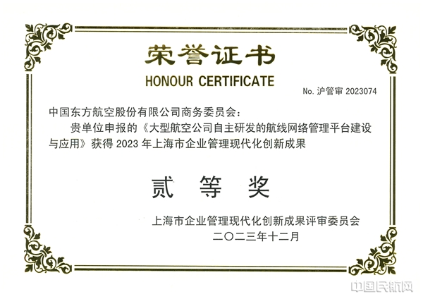 上海市企业管理现代化创新成果评审,自2007年起即由上海市工业经济联合会、上海市经济团体联合会权威承办,至今已累计审定超过3200项企业管理创新成果,涵盖企业管理的各个领域。2023年共有174项杰出成果脱颖而出,其中,东航的航线网络管理平台项目荣获二等奖,充分展现了东航在企业管理现代化方面的创新实践和显著成效。