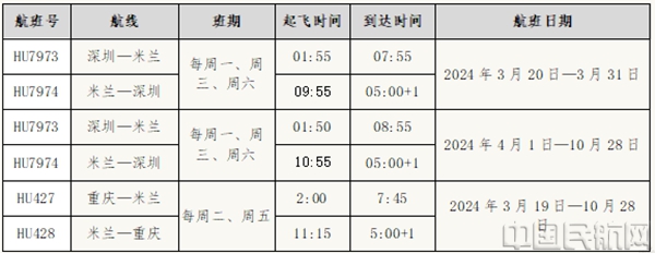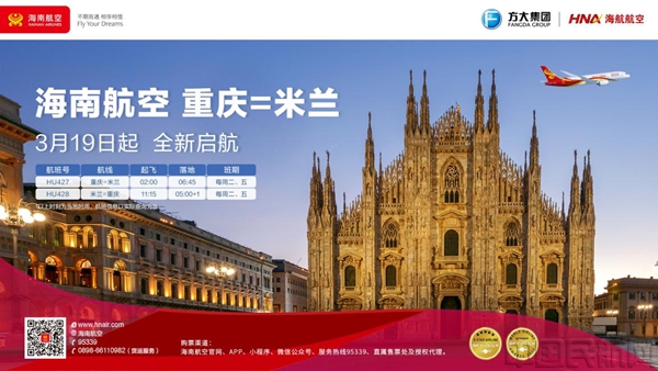 海南航空于2023年9月20日起开通深圳—米兰国际航线,每周执行3班往返,班期为每周一、周三、周六。去程航班于北京时间01:55从深圳起飞,当地时间07:55到达米兰,飞行时长预计13小时;返程于当地时间9:55从米兰起飞,次日北京时间05:00到达深圳,飞行时长预计12小时5分钟;此外,海南航空自今年3月19日起,同步开通重庆—米兰国际航线,每周执行2个往返航班,班期为周二、五,去程航班于北京时间2:00从重庆起飞,当地时间6:45抵达米兰,飞行时长预计11小时45分钟;返程于当地时间11:15起飞,次日北京时间05:00抵达重庆,飞行时长约10小时45分钟。以上均为当地时刻。深圳、重庆至米兰航线的开通,进一步助力中国与意大利之间的人文交往及经贸往来。
