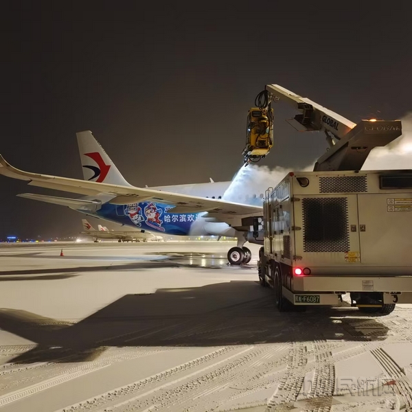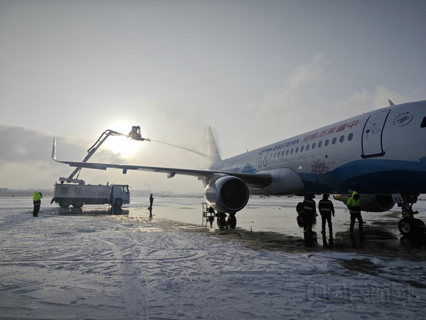 连夜降雪,机坪气温骤降、积雪严重,让出行变得困难,给甘肃分公司航班保障带来压力和挑战。为做好雪天的安全航班保障,东航人按照预除冰预案,凌晨5:00就开始了航前除冰作业,提前进入备战。