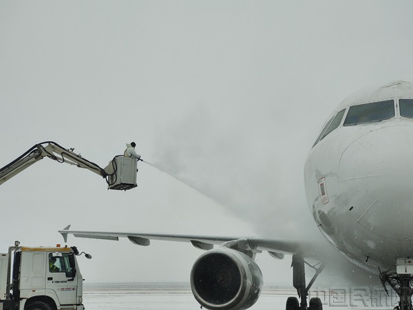 连夜降雪,机坪气温骤降,积雪严重,出行变得困难,给甘肃分公司航班保障带来压力和挑战。为做好雪天的安全航班保障,东航人按照预除冰预案,连夜开始航前除冰作业,提前进入备战,起飞前再次除冰,确保航班顺利运行。