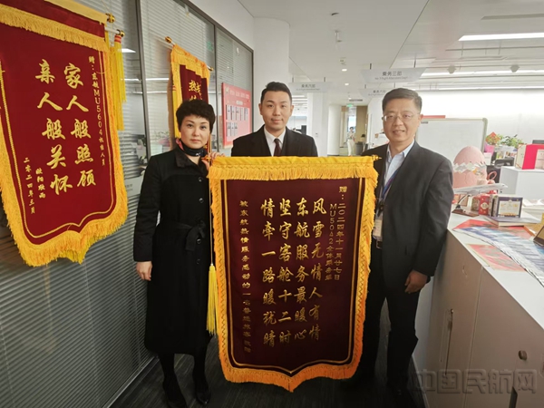 陈莉(左)和同事们事后收到了被感动的旅客送来的锦旗(本文图片均由东航客舱部供图)