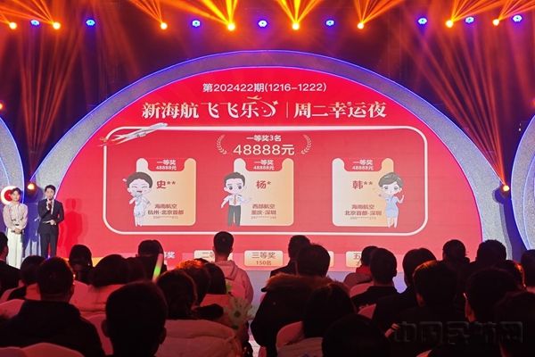 《中国民航报》、中国民航网 记者许晓泓 通讯员代兵 报道:12月24日,新海航“飞飞乐”周二幸运夜现金抽奖活动第22期在北京举行。新海航旗下11家境内航司当晚均通过各自网站发布了“飞飞乐”活动升级礼遇公告,宣布即日起每期中奖名额公布次日零时起30个日历天内,中奖旅客预订海航航空集团旗下境内11家航司自营国内指定航班,可享受经济舱全价票价三折购票优惠。