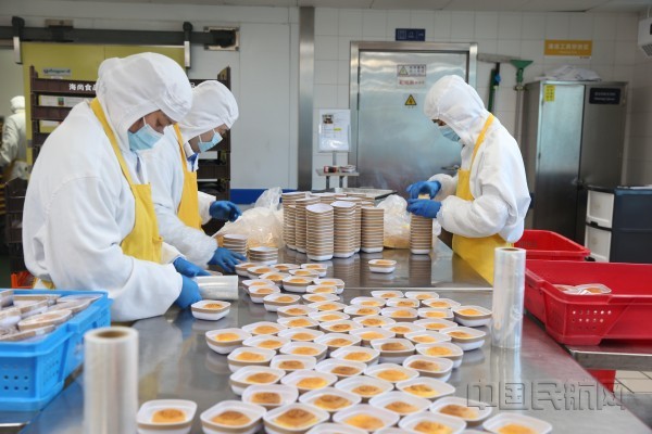 一份航空餐食从诞生到呈现给旅客面前,还需要经过摆盘师、装餐师、点心师、切配师等工种的同心协力。