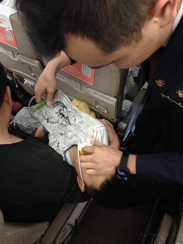 航班起飞后约40分钟,坐在经济舱的7岁男孩陈林远突然捂住腹部,额间渗出冷汗。临近乘务员第一时间察觉异常,立即向乘务长安瑞东报告。安瑞东迅速带领乘务员赶到现场,一边安抚家属情绪,一边为小宇递上温水并敷上暖水瓶,试图缓解症状。