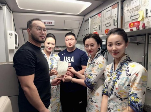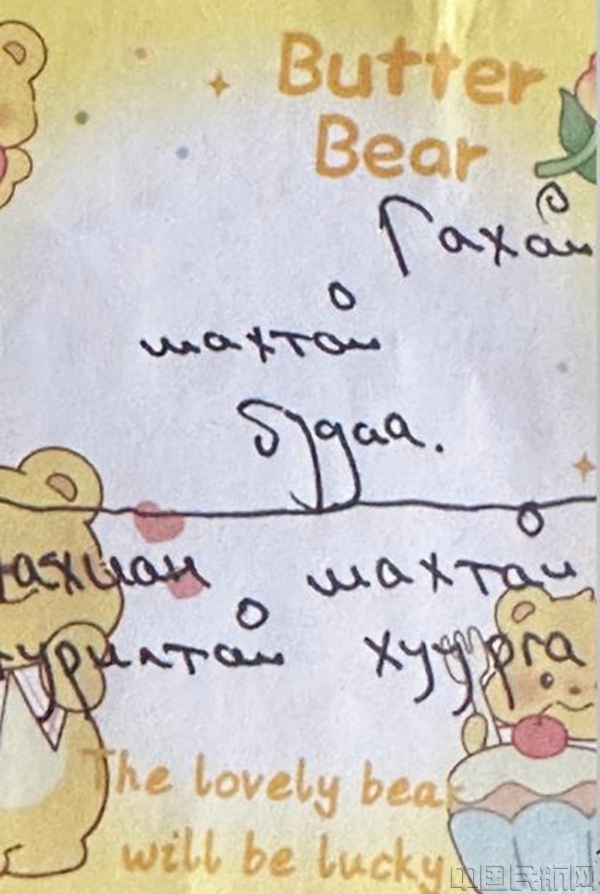 为了让旅客在异国他乡感受到来自中国的温暖,刘坤思考片刻后回到服务间,在起飞前用翻译软件将需要沟通的相关信息翻译成蒙文记录在便笺纸上。餐饮服务时,旅客们看到乘务员递过来写着蒙文的便笺纸“Сайн байна уу, та юу идмээр байна?”(“您好,请问您想吃点什么呢?”)及蒙文菜单,眼神里充满了惊喜与感动,双手合十向乘务组表达感谢。下机前,蒙古国代表团为乘务组写下一封情深意切的感谢信。