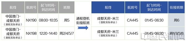 记者从国航西南分公司了解到,新航季国航会携手澳门航空,在成都天府机场推出跨航司通程登机服务。凡乘坐国航法兰克福或米兰航线航班经成都天府国际机场中转,前往中国澳门的旅客,或从中国澳门经成都天府国际机场中转,搭乘国航航班前往法兰克福或米兰的旅客,可享受一次值机、一次安检、行李直挂的便利服务。