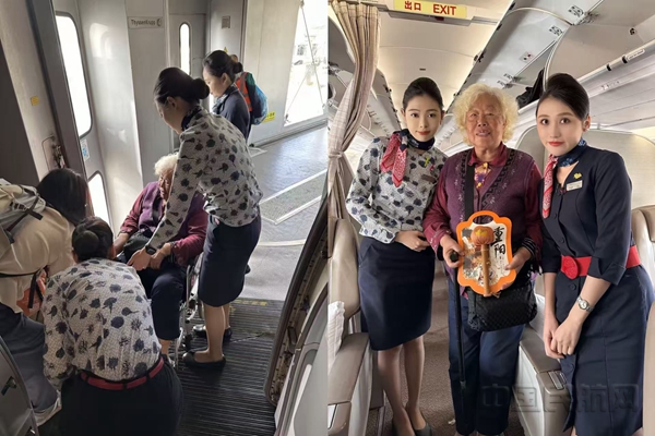 为传承中华民族尊老敬贤的传统美德,乘务组将浓浓敬老情带上了万米高空,让旅客在云端之上也能感受别样温暖。飞行途中,乘务组对老年旅客开启“一对一”贴心服务,协助安放行李并调整座椅角度,以细致入微的关怀化解老人们的出行顾虑。在餐饮服务结束后,乘务员贴心的为年长旅客及陪伴父母出行的旅客送上了“艾草养生锤”。“这艾草锤握在手里暖暖的,太实用了!”来自厦门的陈奶奶接过礼物,连连向乘务员道谢,客舱里洋溢着温馨的节日氛围。