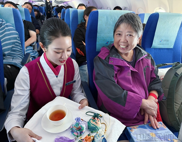 “欢迎登机,祝您重阳安康!”清晨的上海浦东机场,南航乘务员在登机口微笑着向旅客致以节日问候。当航班进入平飞阶段后,乘务员手持盛满菊花茶和茱萸香囊的托盘,逐一为老年旅客送上祝福。温热的茶饮与精致的香囊,伴随着乘务员暖心的问候语,承载着对长辈健康长寿的美好祝愿。