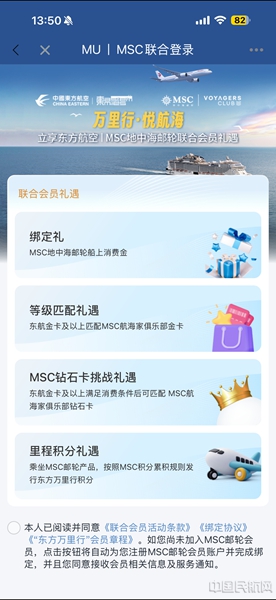随着联合会员计划开启,东方万里行会员可通过东方航空APP、东航官方微信小程序或“MSC地中海邮轮官方预订”微信小程序一键绑定成为联合会员,并享受多重专属礼遇(具体以官方公告为准)。