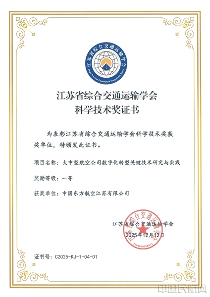 《中国民航报》、中国民航网 记者胡夕姮 通讯员孙金禄 报道:12月20日,在江苏省综合交通运输学会(协会)二届四次理事会扩大会上,东航江苏公司申报的“大中型航空公司数字化转型关键技术研究与实践”研究项目荣获2025年江苏省综合交通运输学会科学技术一等奖。这是江苏民航单位首次获得该奖项。