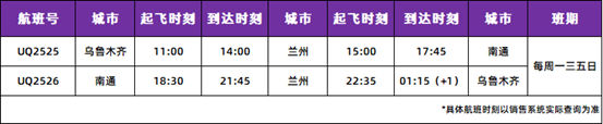 新航线班期为每周一、三、五、日。去程航班UQ2525,11:00从乌鲁木齐天山国际机场起飞,14:00抵达兰州中川国际机场,15:00从兰州中川国际机场起飞,17:45抵达南通兴东国际机场。返程航班UQ2526,18:30从南通兴东国际机场起飞,21:45抵达兰州中川国际机场,22:35从兰州中川国际机场起飞,次日凌晨01:15抵达乌鲁木齐天山国际机场。