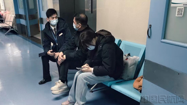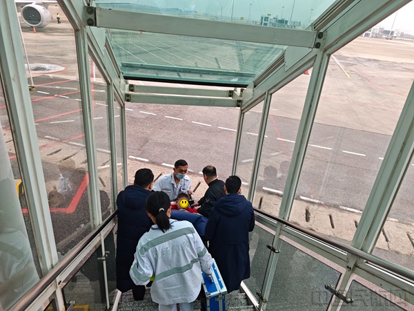 接到通知后,东航武汉地服部立即启动应急预案,业务骨干李博灿、赵娜娜携带着地面轮椅与客舱轮椅,第一时间赶往登机口严阵以待。
