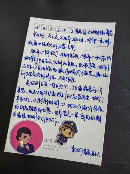 MU6282乘务组成员给旅客苏女士写下心意卡,转达对她和她妈妈的问候