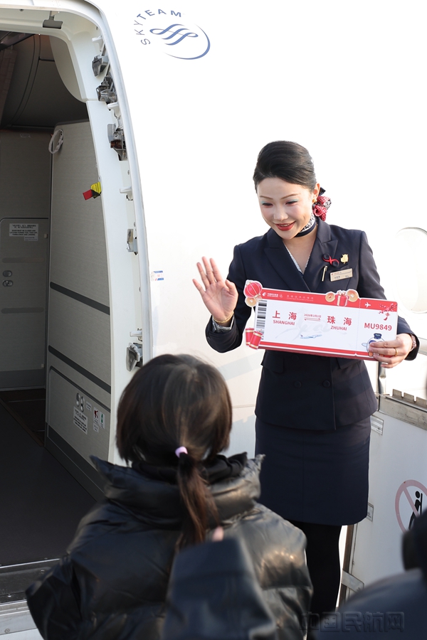 春运首日,东航C919投入“上海—珠海”,乘务组迎接小旅客登机(东航供图)