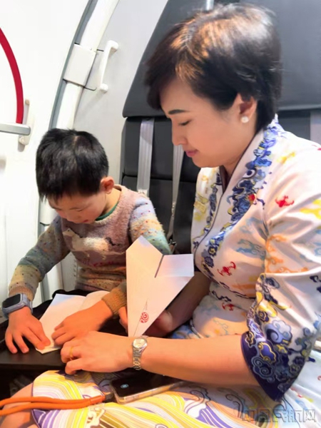 2月的航班上,一位带着5岁儿子的年轻妈妈因旅途劳累沉沉睡去。孩子天性活泼,母亲顾不上照看,小家伙有些不安,在座位上扭来扭去。为了让母亲安心休息,也为了确保孩子安全,郭雯燕征得同意后,轻轻把小男孩带到服务间空位坐下。她没有用标准的“安全须知”约束孩子,而是拿出一张卡纸,陪他折起纸飞机。