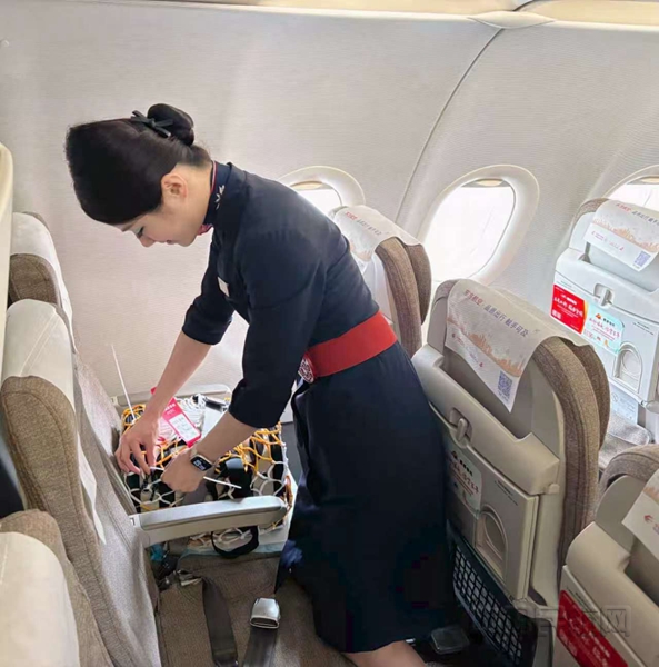 当天,这位旅客带着猫咪进入客舱后,这只可爱的小猫咪便安静待在符合航空标准的专用宠物箱内。根据服务规范,小猫咪被妥善安排在经济舱最后一排靠窗座位,与主人近距离相伴,乘务员也及时协助旅客关注宠物情况。航程中,小猫偶尔好奇张望四周,全程乖巧安静,没有打扰周围旅客。