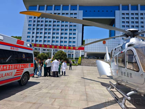 考虑到患者颅脑创伤术后不耐颠簸,机组申请保持1200米标准气压高度飞行,以获取更平稳的飞行状态。在湘西州人民政府、120急救中心协同支持下,湘西自治州人民政府广场被紧急开辟为临时起降场。机组落地后,当地120急救中心迅速将患者转运至直升机上。