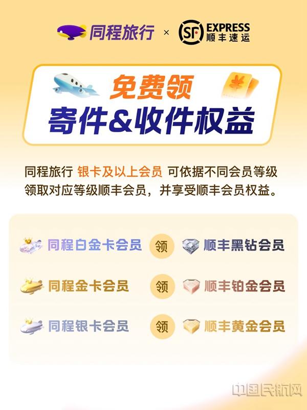 即日起,同程旅行银卡及以上会员、顺丰黄金及以上会员可根据不同等级,免费领取对应会员并同步享受特权。例如,同程白金卡会员可领取顺丰黑钻会员,同程金卡会员可领取顺丰铂金会员,同程银卡会员可领取顺丰黄金会员。
