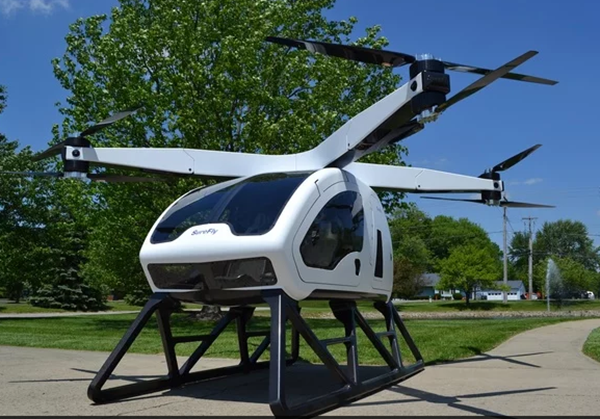 这架名为SureFly的直升机机身大量采用碳纤维材料,因此自重仅有1100磅(约499千克),还能载两名乘客。原理类似于无人机。