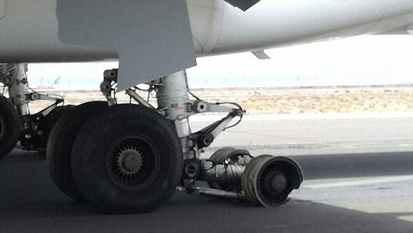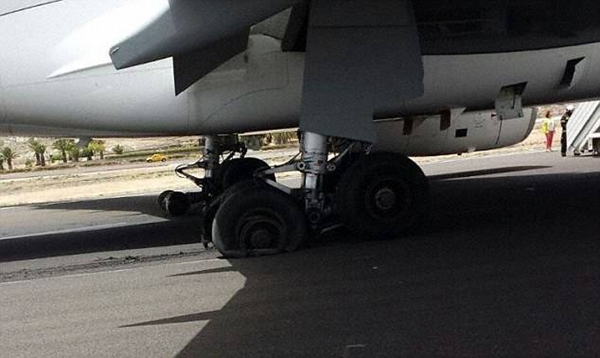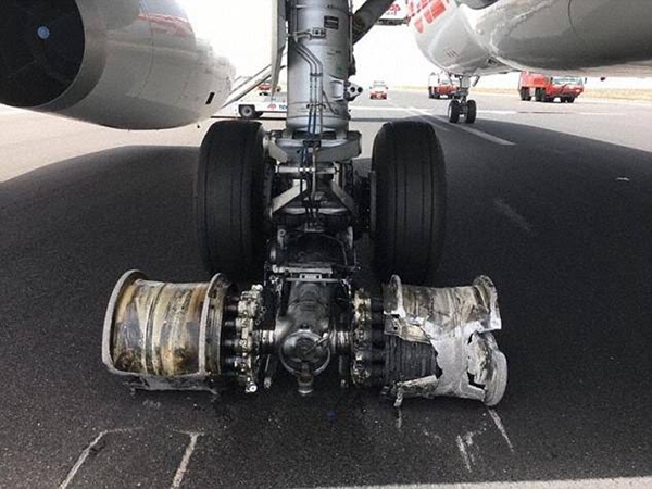 (发生事故的飞机局部,画面可见一处轮胎已经塌陷下去)