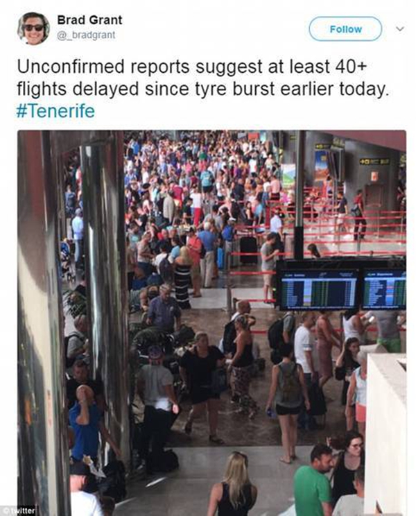 据外媒报道,2017年6月27日,英国特内里费机场一架飞机着陆时发生爆胎,导致该机场关闭数小时。上千名旅客滞留机场。