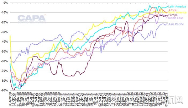 2020年3月30日至2022年8月8日,各地区航空旅客周座位量与2019年相比的百分比变化(来源:CAPA - OAG航空中心)