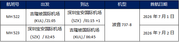 除持续深化中国市场布局外,马航亦在加快推进全球航线网络优化升级。自2026年7月1日起,菲律宾马尼拉航线将由每周21班增至28班;澳大利亚布里斯班航线将自2026年8月16日起由每周5班增至6班,并于2026年10月25日起进一步提升至每日一班;斯里兰卡科伦坡航线则自2026年4月3日起由每周7班增至8班,并分别于5月3日及5月20日起进一步增至每周9班及10班。与此同时,马航还将于2026年9月2日起恢复日本福冈直飞航线,每周运营5班,持续提升其在亚太区域的航线网络覆盖与枢纽联通能力。(编辑:王亚玲 校对:李海燕 审核:程凌)