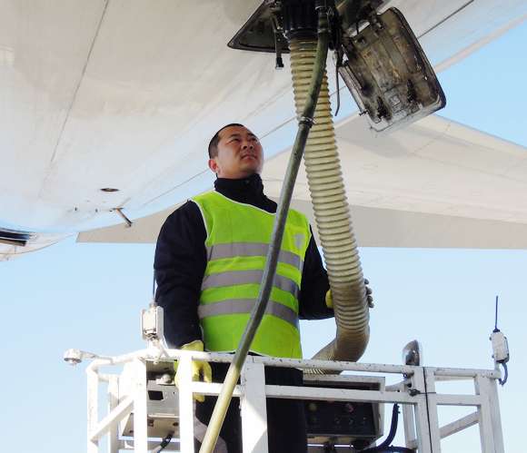 由于飞机机型不同,飞机污水排放口的位置和数量也相同,波音757机型就分别有四个排放口,这就要求污水车司机先后需要四次挪动车辆,与飞机进行对接,常年默契的配合在门丕格和马欢所有的动作里显得那么随心所欲,门师傅驾驶着污水车沿机尾线向机身缓缓靠近,靠近红线区时,搭档马欢下车,手持指示牌指挥污水车倒车,伴随着马欢停车手势的举起,门丕格师傅也将车稳稳地停在与飞机对接的最佳位置上。马欢跳上污水车尾部的操作台,升起工作平台,打开飞机机身舱盖,落下拉杆,高举起污水管熟练地完成对接动作,污水沿水管顺流而下……与此同时,污水车驾驶内的门师傅密切注视着飞机动态,随时等候着移动车辆的指令。