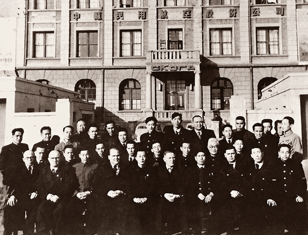 图为1952年,中苏民航股份公司管理委员会会议代表在位于北京王府井南口原东长安街15号的公司办公楼前合影