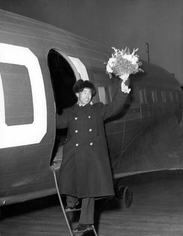 图为1955年1月1日,中苏民用航空股份公司钟的苏方股份全部移交中国后,中国民航首次班机飞往伊尔库茨克,机长滕广善向欢送的群众致意