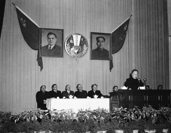 图为1954年12月31日,国务院副总理陈毅在中苏民航公司交接大会上讲话