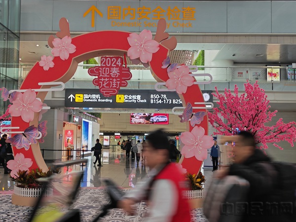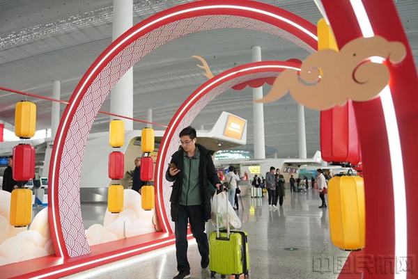 记者在现场看到,⽩云机场两座航站楼都进行了节庆氛围布置,鲜花、灯笼、门楼等喜庆元素将出发厅、到达厅装饰一新。年俗与国⻛结合的新潮年味打卡点,吸引不少旅客在此拍照打卡。