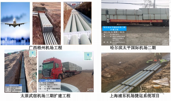 鑫宝通BWFRP电缆保护管致力于电缆保护管行业的高质量发展,产品具有环刚度高、抗拉力强、内壁光滑、导热性优、耐腐耐水、耐高低温、电绝缘高、阻燃性强、易运易装、低碳安全环保的十大优势。在民航机场建设中的应用也取得广泛好评。目前已在哈尔滨太平机场、山西武宿机场、成都天府机场、云南保山云瑞机场、西宁曹家堡机场、西安咸阳机场、沈阳桃仙机场、沈阳东塔机场、菏泽牡丹机场及上海浦东机场四期捷运系统等项目中应用,并取得一致的好评。同时,鑫宝通BWFRP被纳入国网双创推广产品,在国网及南网都有广泛应用,市场反馈良好。