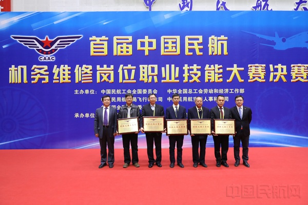 中国民用航空局综合司司长刘鲁颂、中国民航大学书记景一宏为获得大赛团体优胜三等奖的参赛队颁奖(卫柯毅/摄)